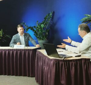 Piedaloties vebinārā “Domāt augstāk par vidusmēru jeb kā neietekmēties no necilu cilvēku lēmumiem?”. No kreisās: Māris Auders un Agris Grava. Foto no personīgā arhīva.